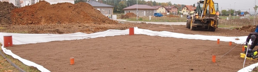 W przypadku podłoża wodonośnego przy budowie fundamentów pod domy rodzinne stosuje się podsypkę ze żwiru lub piasku żwirowego. Podczas następnego betonowania wskazane jest ułożenie na tak przygotowaną powierzchnię geotkaniny (ewentualnie folii). W tym przypadku odpowiednie jest zastosowanie geowłókniny polipropylenowej o wyższej odporności na przebicie.